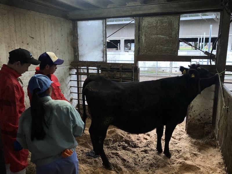 南田さんは将来の仕事を考える中で、和牛繁殖経営農家を選択肢の一つとしています。しかし、八代農業高校泉分校にはウシがおらず、畜産について学習を深める機会が多くありません。今回はその選択肢をより、具体的に検討するために、和牛繁殖経営について学習するために来場されました。本校、牛部の生徒が自分たちの取り組みを説明しました。