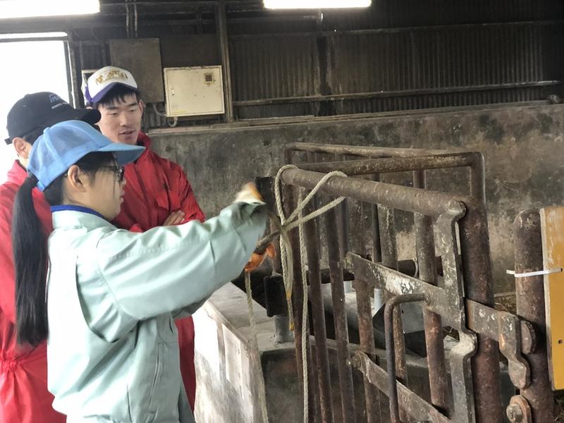 牛のつなぎ方、ロープワークを教えていました。牛部の生徒は南田さんの覚えの早さに驚いていたようです。