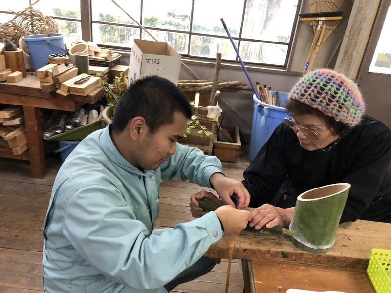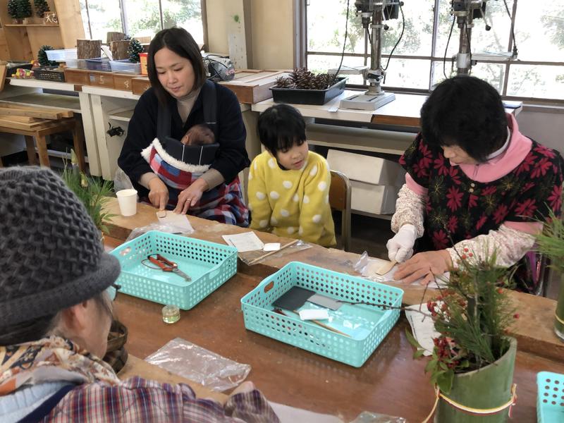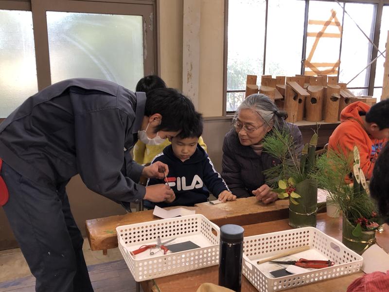 12月27日(金)は、学校開放講座として「ミニ門松づくり」と「ツバキのバターナイフ」づくりをご来校いただいた皆様に体験いただきました晴天に恵まれたこの日、小学生からご年配の方まで木工を大いに楽しんでいただきました。