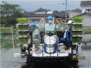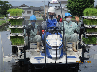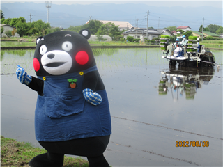 くまモンも登場し、田植機に苗を移動することを手伝ってくれました。今後は栽培管理を行い、美味しいお米が生産できるようにします。
