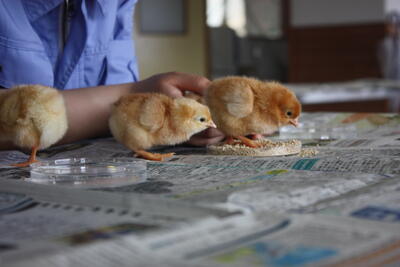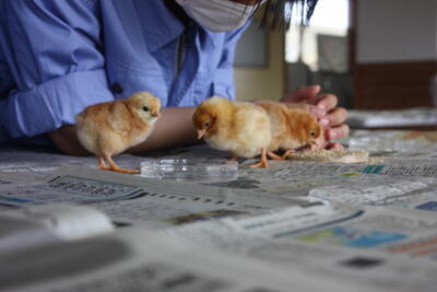 本日、ひよこがやってきました。放課後のボランティアでしたが、20名以上の生徒がかけつけて、到着したばかりのひよこのお世話をしてくれました