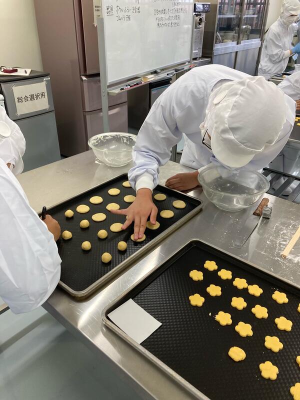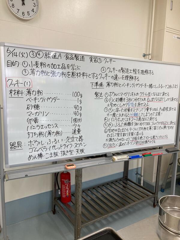 この授業の目的は、①小麦粉の加工品を学ぶ。②クッキーの製造工程を理解する。③薄力粉と強力粉を原材料とするクッキーの違いを理解する。以上の3点を先週の座学とこの実習で学び完結させます。