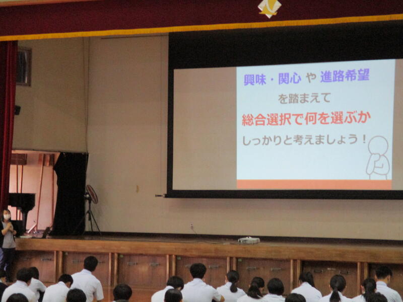 今回の説明会では、1学年担当の松本先生に、今後様々な「選択」する場面が出てくるなかで、自らの意志で選択していくことの重要性と合わせて説明してもらいました。そして、生徒のみなさんが来年から受講するこの授業も大切に選んでもらいたいことも伝えていただきました。9月には2回目の説明会が開催される予定で、その際には各開講科目の具体的な履修内容等が説明されます。その後、10月の選択科目決定に向けてこれから自分がどの科目を選択するのかをしっかり考えていくこととなります。