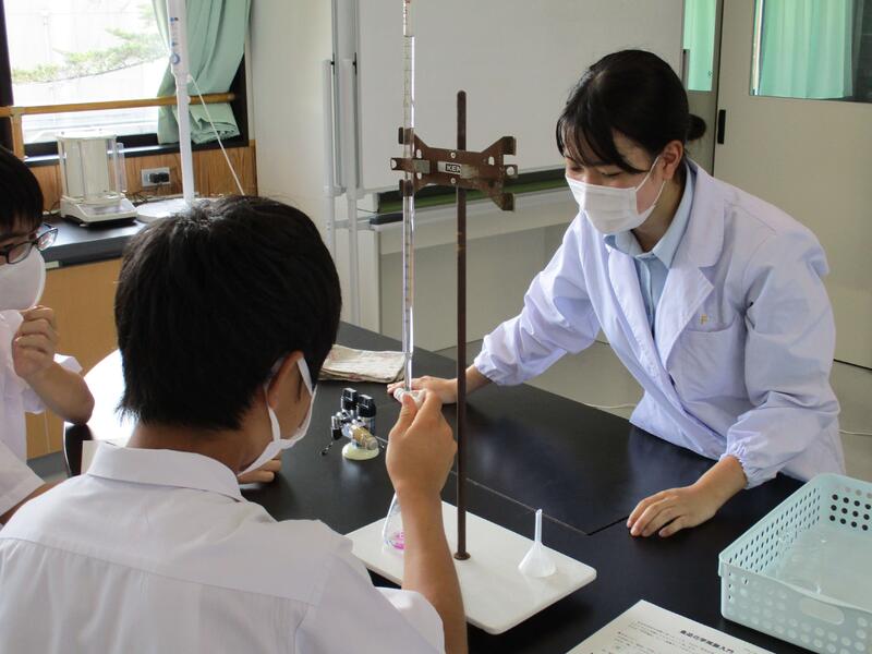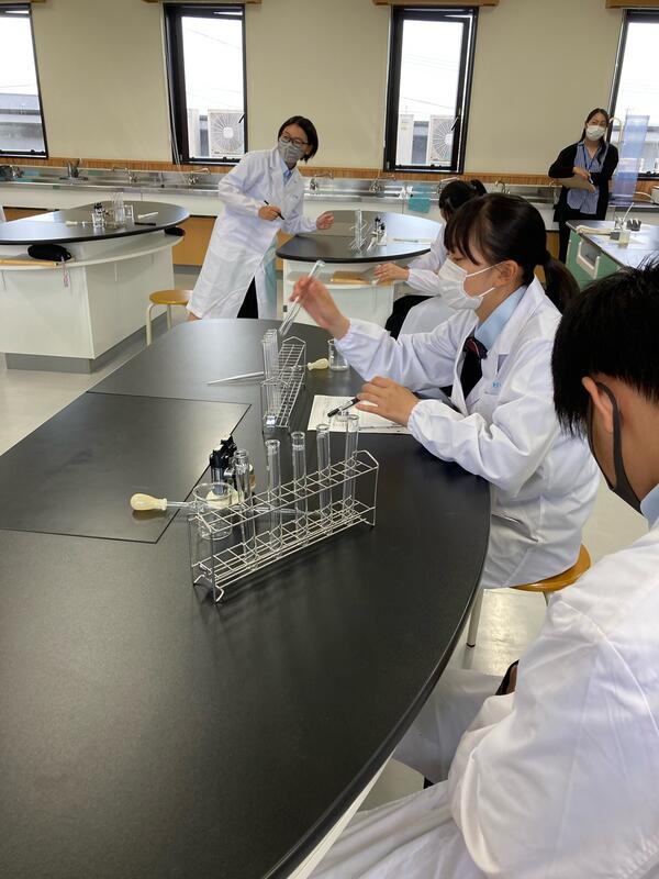 1年食品科学科の生徒が身近な医薬品を用いて駒込ピペットや試験管を使い食品化学実験を行いました。