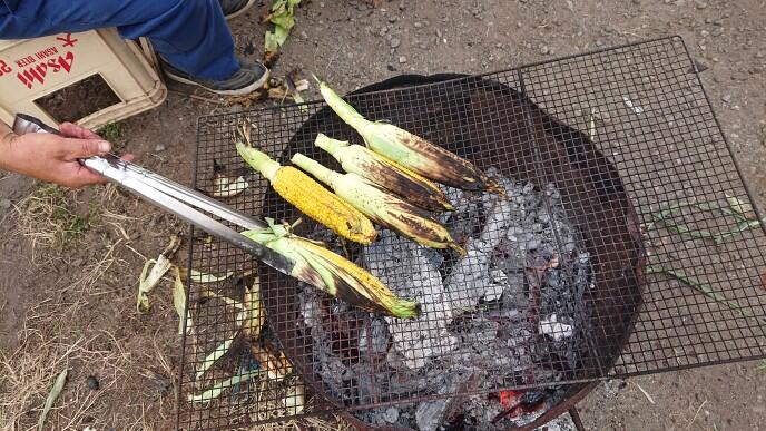 収穫実習は急遽、焼きトウモロコシ試食会に変わりました。