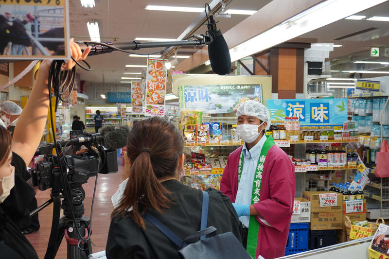 生徒も実際に店舗を訪れ、接客を行いました。生徒たちは、これまで、畜産を学ぶにあたり、肉牛を育て、県内の市場に出荷することは行ってきましたが、今回のように実際に店舗での販売に立ち会うのは初めてでした。生徒たちは「いらっしゃいませ」と大きな声を出し、自分たちが育てたくまもと黒毛和牛をPRしました。また、テレビ取材も入り緊張した面持ちで取材にこたえていました。