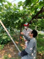 南稜高校では、1年生は短期寮という制度があり、3泊4日で農場当番実習を行います。これは総合農業科の果樹園です。シャインマスカットの実が少しずつ大きくなっています。その中で「摘粒(てきりゅう)」といい実の数を調整していくのです。これによりおいしいシャインマスカットになるのです。