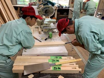 2年生の環境コースの生徒たちは、木工技術を高めています。木材にホゾとホゾ穴を入れ、ノミで削りながら組み合わさるように調整します。きつすぎると材が割れてしまいますし、ゆるすぎると強度がなくなってしまいます。何度も調整を繰り返し、ピタッと材が組みあがりました。