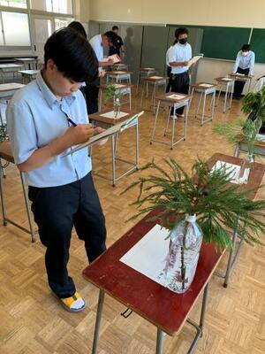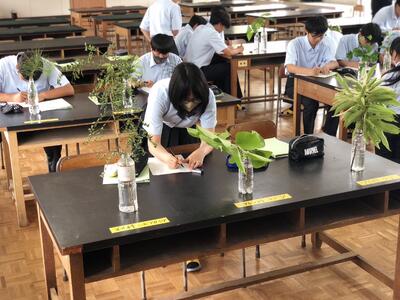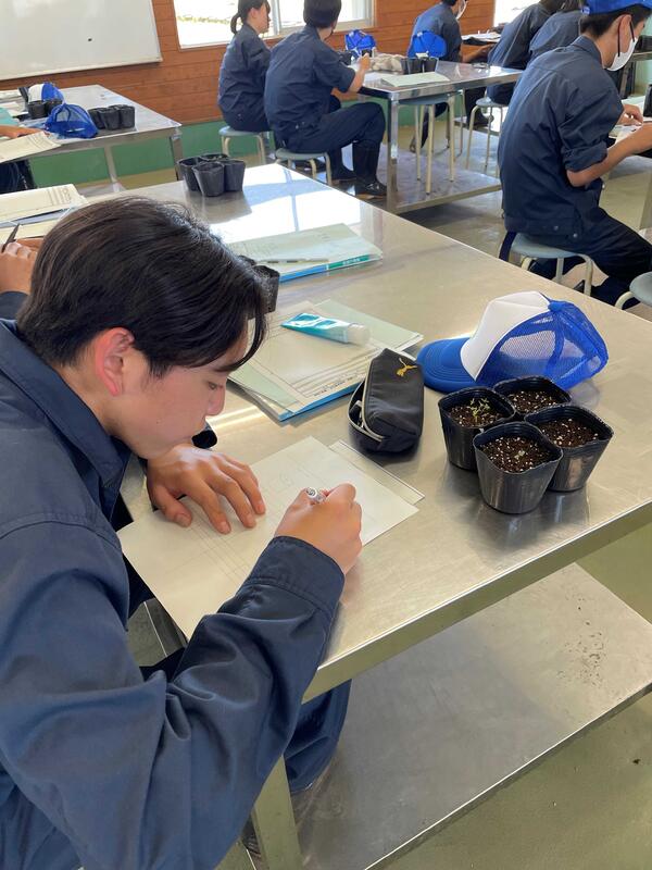 農業関係高校では、「農業鑑定競技」というものがあります。これは専門の道具や植物などについて知識を問われる大会です。現在、県大会に向けて校内大会の勉強をしています。1年生も頑張って樹木のスケッチを描いていました。このような勉強で専門性が身に付くのですね。