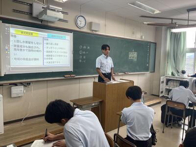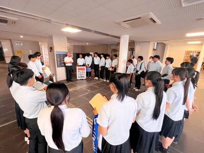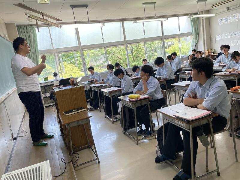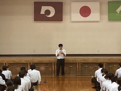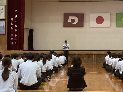 学年主任の村橋先生より、考査を頑張った生徒たちへの労いの言葉とともに、これから本格化する進路実現に向けて何が大切か、生徒たちに問いながらお話をされました。「相手のことを知る」「ウラオモテがない人になって欲しい」というお話はとても心に残りました