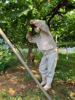 先生から摘粒の方法について説明を受けます。中腰での仕事は大変です。