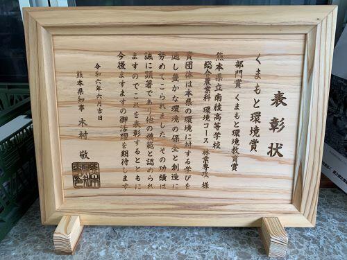 南稜高校の総合農業科、環境コース、林業専攻で継続して行っている木育活動や森林の保水力調査等が評価され、くまもと環境賞(部門:くまもと環境教育賞)を受賞しました。令和2年熊本豪雨災害以降行ってきた地域復興の取り組みが評価されたことは、在校生、卒業生にとって大きな成果となりました。今後も、継続して取り組んでいきます。