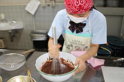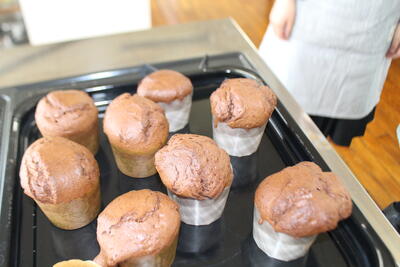なので、お疲れ様会として、マフィン作りに挑戦しました 1・2年生は、チョコマフィン 3年生は、抹茶マフィンです