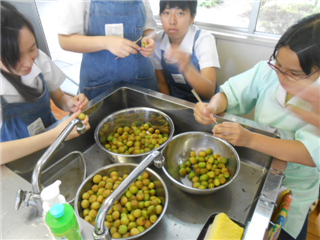 5月25日(水)、校内の梅を収穫し、梅干し・梅ジュースの下ごしらえをしました。
