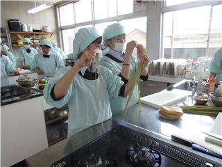 旬の食材をいただきます☆ 投稿日時 : 2019/05/30 投稿者5 5月29日(水)3,4限目に生活経営科の3年生が「フードデザイン」の 授業で「グリンピースご飯とふきの信田巻き、きゃらぶき」を作りました。 初めてふきを調理したり、食べたりした生徒たちも多かったようです。 貴重な経験になりました。 ご飯は土鍋で炊きました!