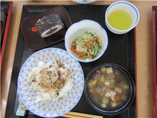 山菜おこわ、つぼん汁、切り干し大根の酢の物、あん入りちまきを
