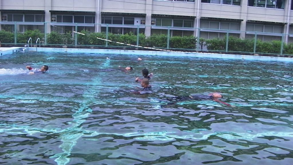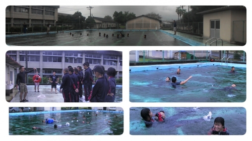上球磨消防署の御協力で、次は、着衣泳法の実地訓練をプールで行いました。