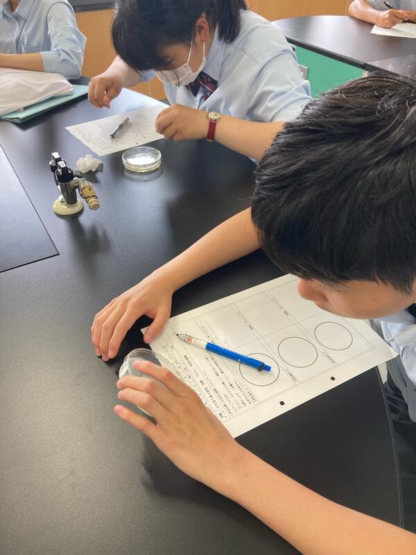 昨日の3,4限目は微生物の授業です。3限目は、空中落下菌を採取した後、恒温器で培養したものをまずは目で見てスケッチをしました。とても真剣です。4限目は顕微鏡の使い方を学習した後、実際に米粉と片栗粉を観察しました。