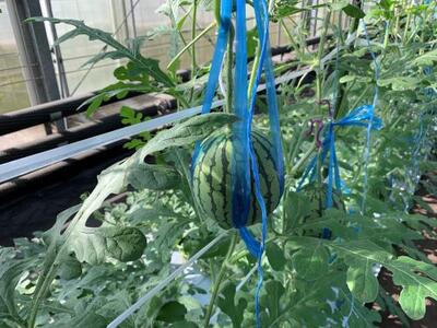 植物コース野菜専攻は、まさに今、大忙しです。肥後グリーンの収穫をしながら次は、スイカです。温室の中で、温度や水分を確認し、一株ごとに生長の様子を見守っています。一度、試食をしてみましたが、なかなか甘みがあったようです。もうすぐ収穫の時期です!。