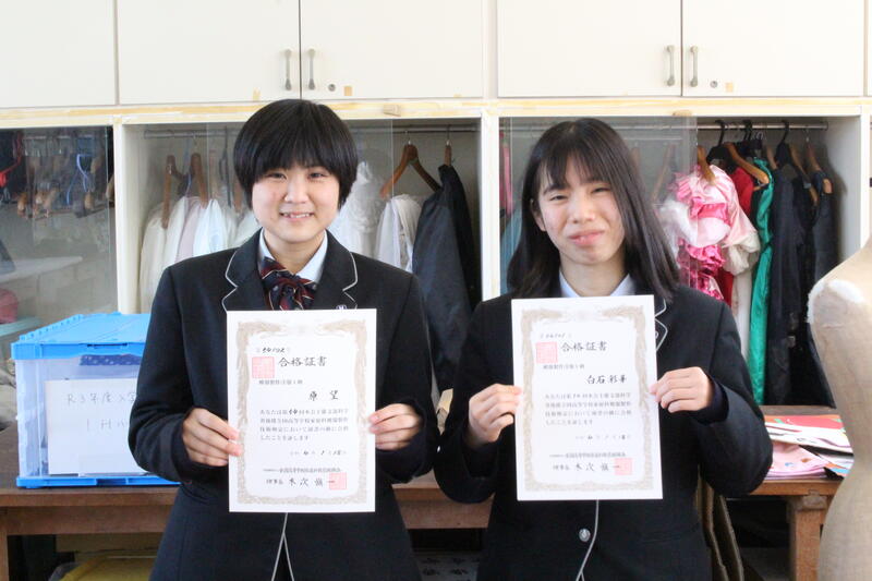 3年生活経営科の白石さん、原さんが家庭科技術検定1級(洋服)に合格しました
