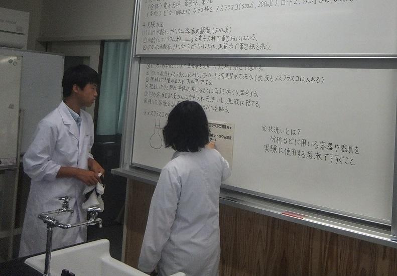 6月7日、食品科学科3年生が、標準溶液の調整に取組んでいました。なかなか難しいようで何回もやり直す班も見られました。
