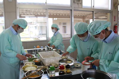 1Hは、家庭総合の授業で、班での調理実習を行いました