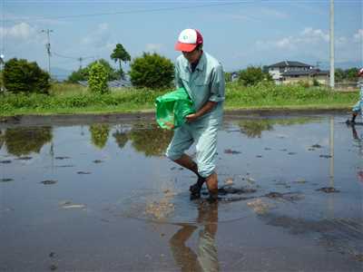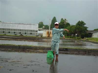 EMボカシ肥は手作業で行っていきます。水田を区画に分けて、自分の場所を責任を持って散布していきます。風で流され自分にかかることもありますが、そんなことも気にしません!