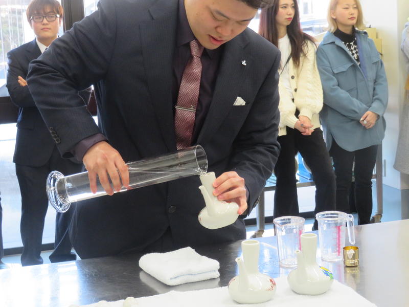 蒸留した焼酎の原酒を水で割って25度に調整し、ガラ(酒器)で注ぎ分けたら、