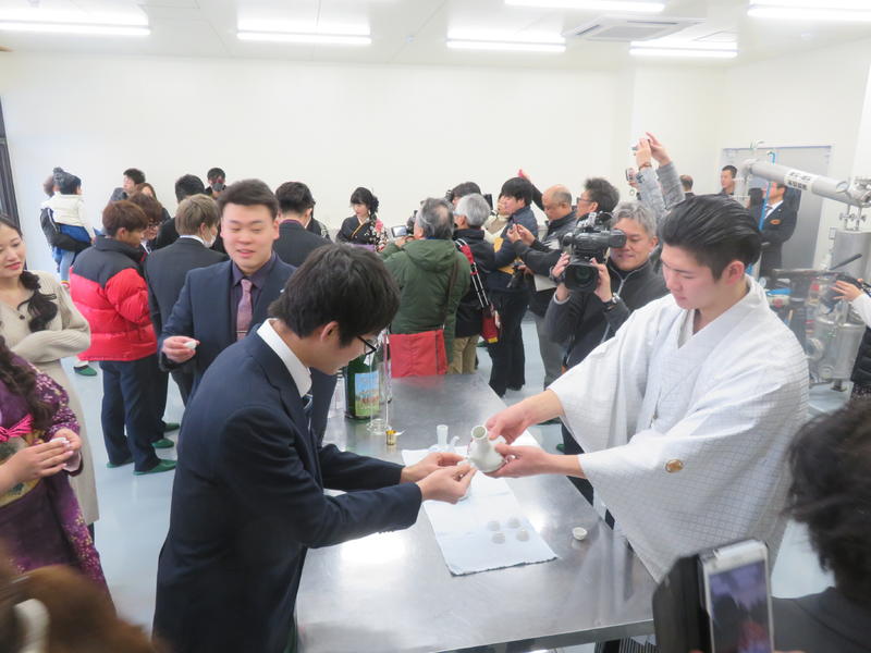在学時の室長の発声で乾杯!2年前に自分たちで製造した焼酎を、ようやく味わうことができました。
