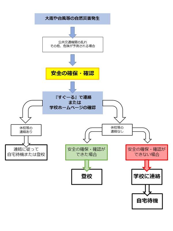 大雨や台風等により生徒の登下校の安全が危ぶまれる場合、次の事項に御留意のうえ、安全確保を第一として対応をお願いします。