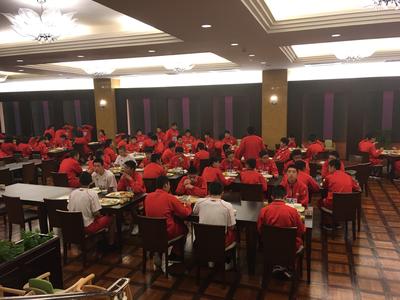 生徒たちは、ご飯をもりもり食べて、スキーに向けて準備をしています。