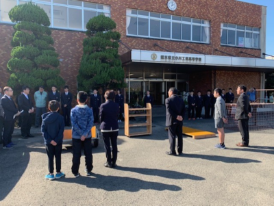 本校では、小野部田小学校にリヤカー(機械科)、クマモト農家ハンター様にイノシシ箱罠(機械科)、小川小学校に移動棚(建築科)、河江小学校にジャンプボード(設備工業科)をそれぞれ1台づつ贈呈させていただきました。