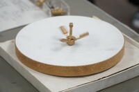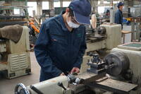 (旋盤での切削実演と、説明を聞く中学生、加工されて回転する駒の実演)