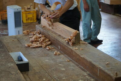 (木工実習室で、削り方や道具の使い方を実演したり、様子を見守ったりしている様子)