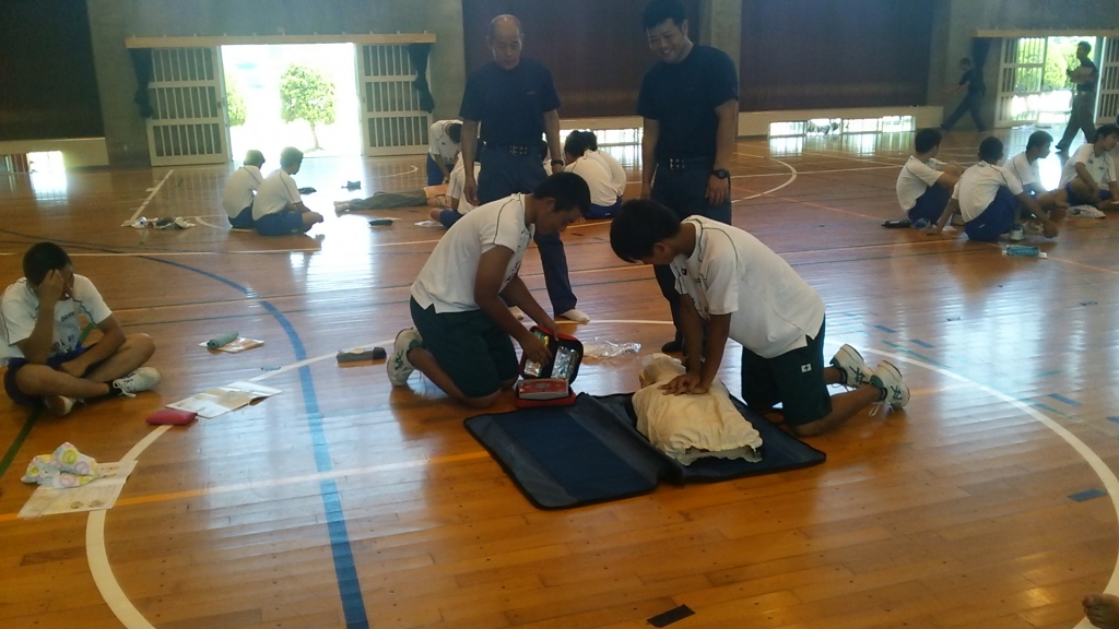 「30回連続して胸骨圧迫するのはきつかった。」「倒れた人に出くわしたら、率先してできるようがんばります。」(1年保健委員)