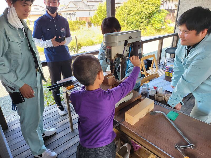 令和7年11月22日(土)に課題研究の授業の一環として宇土市立鶴城中学校の生徒にものづくり体験教室を実施した。各作業毎のブース(墨付け、切断、穴あけ、組立)を設けた。