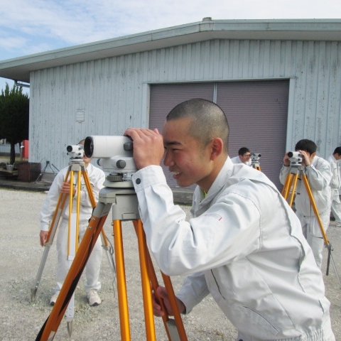 土木科1年生、工業技術基礎の実習風景です。トランシットという測量機器を用いて、角度を測ります。角度は1度の3600分の1という、とても小さな精度で測ります。