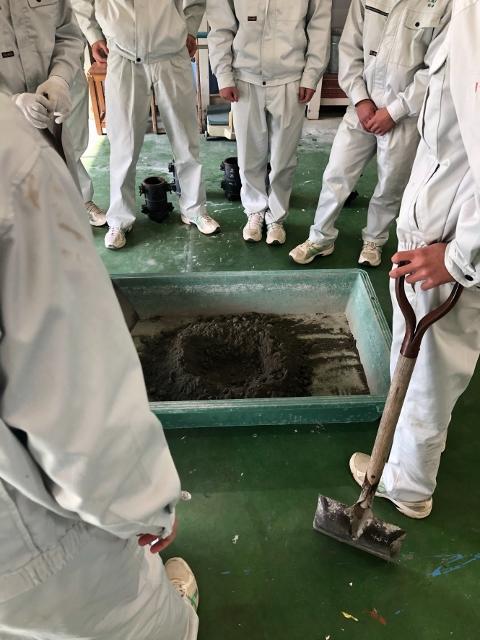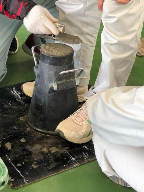 土木2年生のコンクリート実習班の様子です。今回はスランプ試験を行いました。
