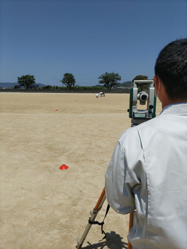 道路の曲線等を設置するための「路線測量」を実習で行いました。自分たちで計算したデータを用いて曲線を設置するため、測量作業の一連の流れをイメージしやすい作業となっています。