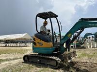 2日目は、グラウンドに出て、走行や掘削の操作を学びました。暑い日差しの中でしたが、真剣な表情で話を聞き、機械に乗り込みました。最初は、戸惑う生徒もいましたが、すぐに覚えて掘削や旋回を行うことができました。