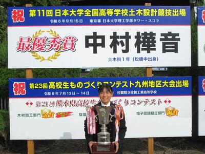 土木科2年内川さんが、自然災害の減災について調査・研究を行い、優秀賞をいただくことができました。昨年の先輩に続く受賞で、とても喜んでいました。
