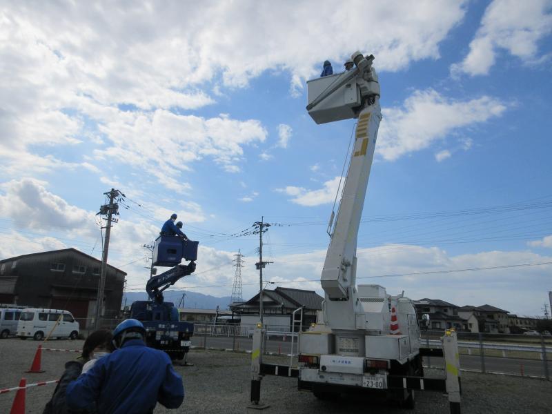 電気工事についてのDVD視聴し、高所作業車乗車体験、腰道具等装着体験を行わせていただき、最後には質問の時間を取っていただいて、生徒たちは普段は聞けないようなお話を聞く良い機会になりました。
