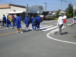 各クラスの交通委員の生徒が、通学する生徒の多い交差点などに立ち、挨拶と声かけをおこなっています。