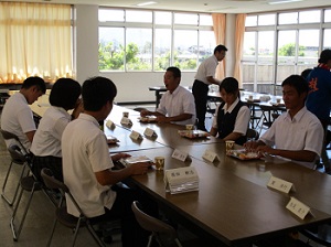 贈呈後は本校生徒会と津山工業高校の生徒会とで生徒会交流会をおこない、地域や学校の紹介や学校案内、一緒に昼食を食べました。
