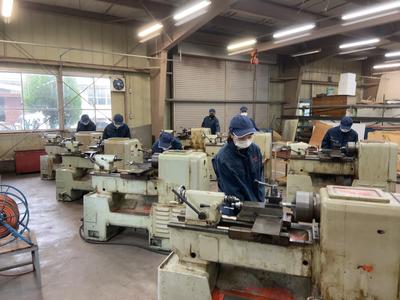 機械科2年生の実習で旋盤作業を行っています。安全に気をつけながら、ものづくりについて学んでいます。