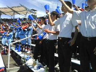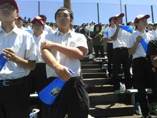 7月9日(月)、雨で2日延びた試合が県営八代球場において行われました。1回表いきなり1番バッター西村君が右中間に三塁打、2番の吉田君がヒットで続き先制します。全校応援のスタンドは大いに盛りがりのスタートとなりました。また、ピッチャー田上君も幾度もピンチを退ける好投で緊迫したゲームになますが、さすがに伝統校熊工は徐々に力を発揮し1対3とリードを奪われます。7回からリリーフした平野航君は、170cmの小柄ながらいきなり138キロのボールを投げ、観衆をうならせますが、8回裏開始時に不運にもけがで降板。2年生投手益田君が重責を果たそうとマウンドに上がりますが、その後猛攻を受け5点を失い、1対8のコールド負けとなりました。しかしながら、正々堂々と強豪校に立ち向かう小川工高生の清々しい姿は、見る者に爽やかな印象を与えました。暑い中に全校一丸となって取り組んだ全校応援は、生徒達の一生の思い出とこれからの本校の教育活動に必ずいかされるものと思います。応援ありがとうございました。