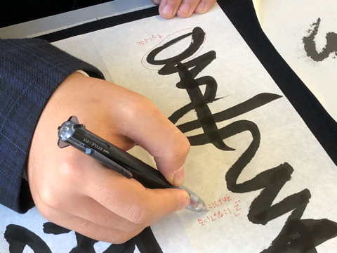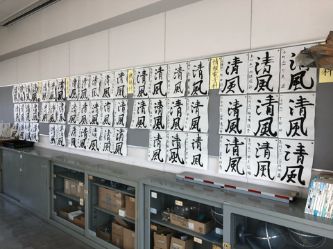 書道、高宗美幸先生の授業の様子です。みんな真剣に取り組み、また互いに相互評価も行うなどたいへん工夫の見られる授業です。