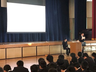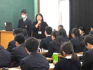 10月5日(金)の6時間目に「ホテル日航熊本」の総務部より下田様が来校下さり、「何のために働くのか」と題して、本校の2年生を対象とした職業講話をしていただきました。スライドを交えて分かりやすく、また実際に体を動かして挨拶の仕方などのご指導をいただき、貴重な時間となりました。