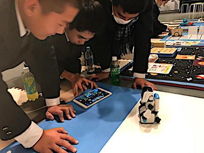 ロボットカーレースでは、小学生と高校生が協力して、プログラムの調整をしていました。