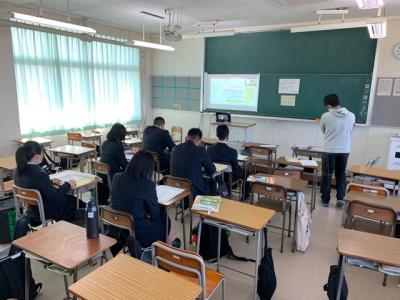 3月5日(金)、進級を目前に控えた2年生の各教室において、様々な企業の情報を得るための「宇城市合同企業説明会」がオンラインにて行われました。